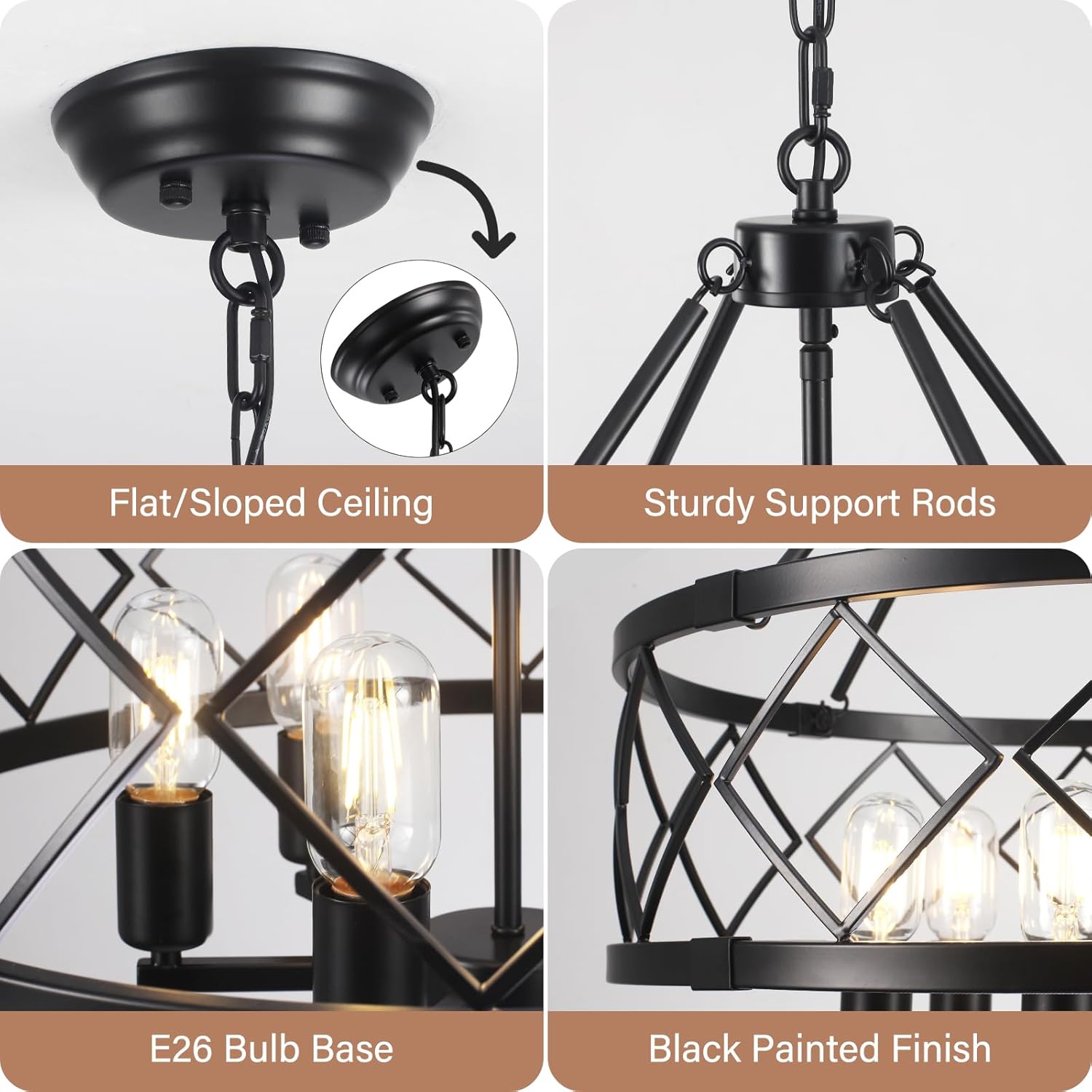 【Black Farmhouse Chandelier】This farmhouse chandelier is made of high-quality iron material, high-temperature anti-rust treatment, sturdy and durable. The black iron drum frame and diamond grid are perfectly matched, showing the beauty of rural retro and modern home