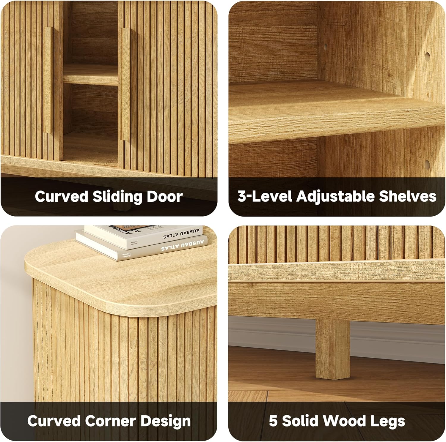8 reviews for 66″ TV Stand for 80 Inch TV, Modern Entertainment Center with Storage Cabinet and Adjustable Shelves, Mid-Century Wood Curved TV Media Console with Sliding Doors for Living Room, Bedroom, Natural Oak