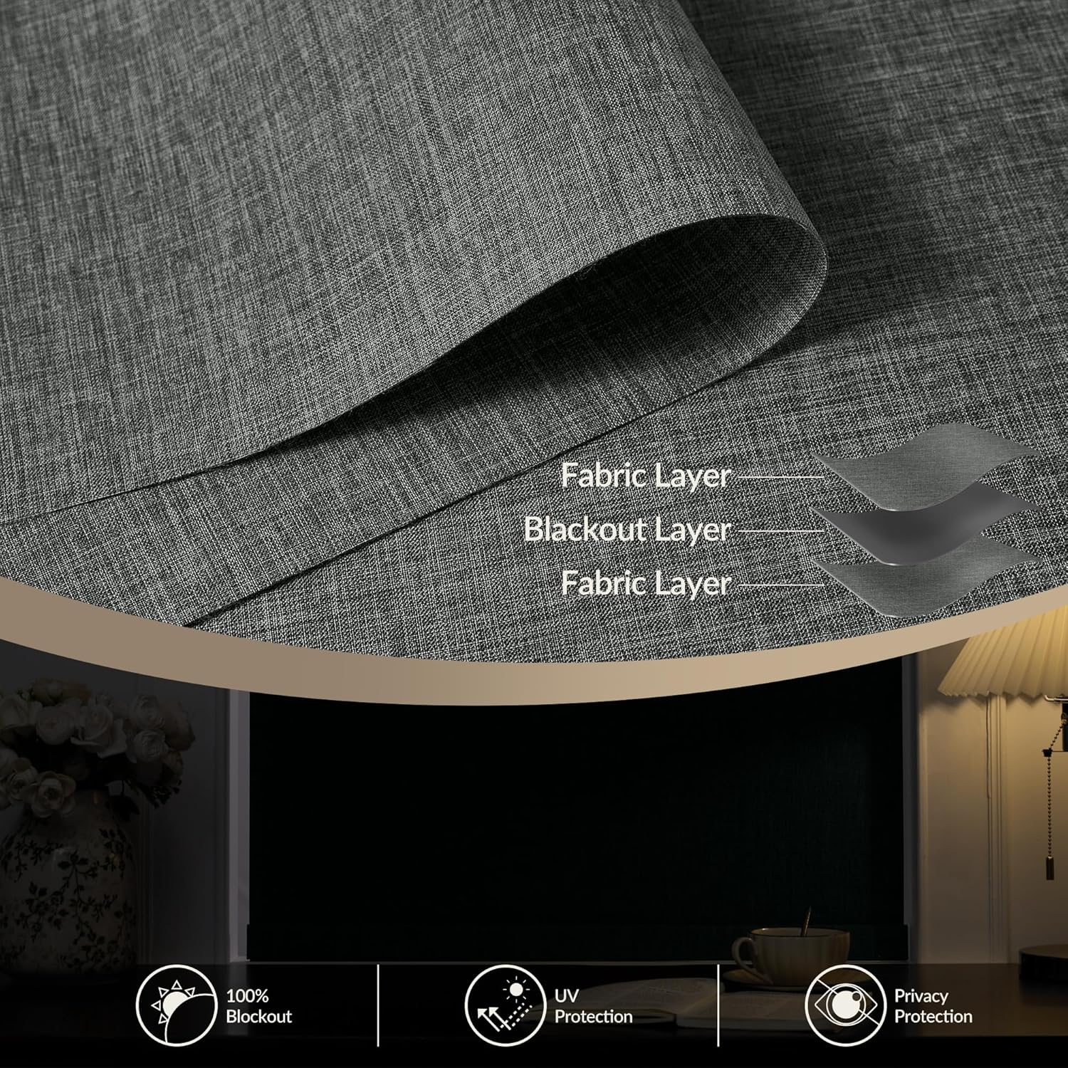 [Material & Key Benefits] 100% blackout linen fabric: Deep room-darkening, great for sleep, naps, or movie nights. Motorized shade perks: Boosts energy efficiency, cuts noise, ensures privacy, blocks UV (protects furniture). Cordless & versatile: Safe for kids/pets; fits living rooms, bedrooms, offices, etc. Indoor use only. Long battery life: Built-in rechargeable battery lasts 3–6 months per full charge—no frequent recharging.