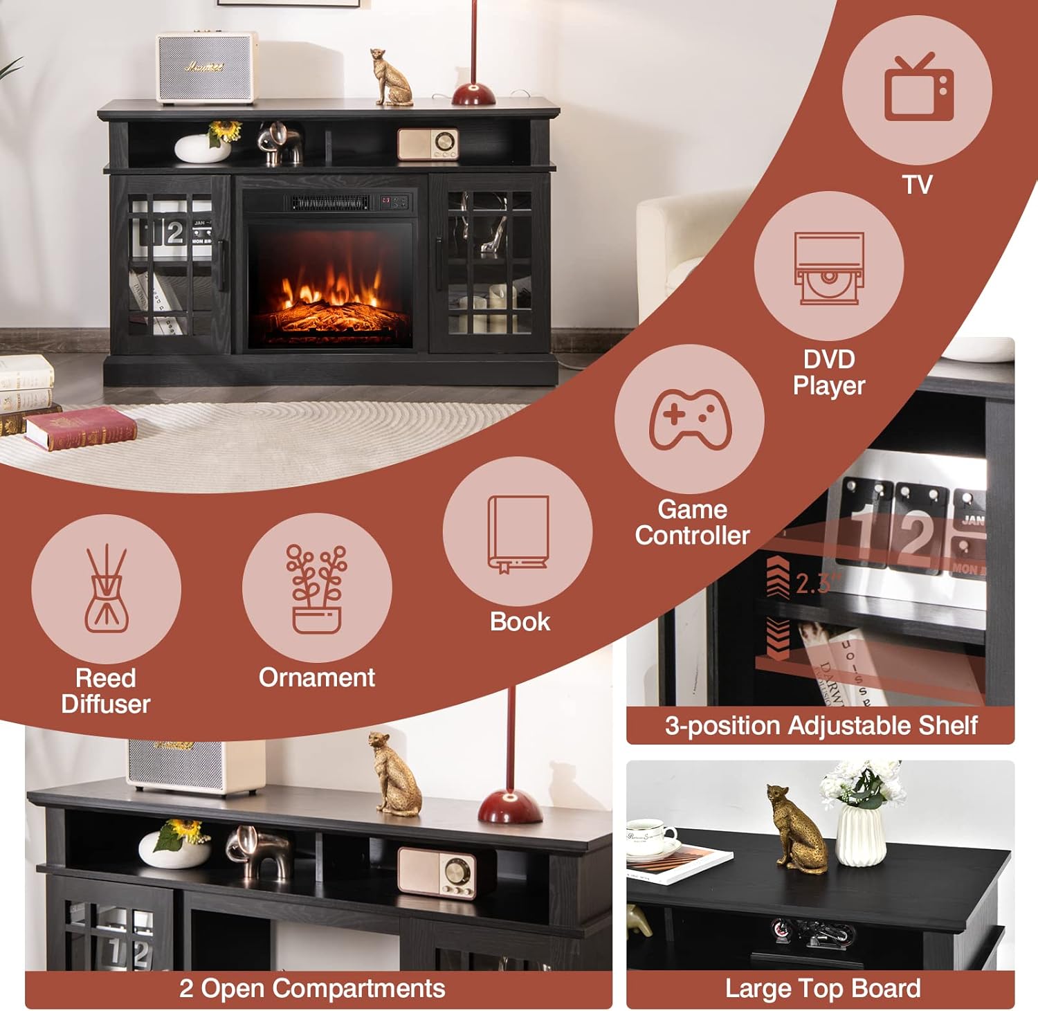 13 reviews for COSTWAY Electric Fireplace TV Stand for TVs Up to 55 Inches, 18-Inch Fireplace Insert with Remote, Overheat Protection, 48-Inch Wooden Media Entertainment Center with Adjustable Shelves, Black