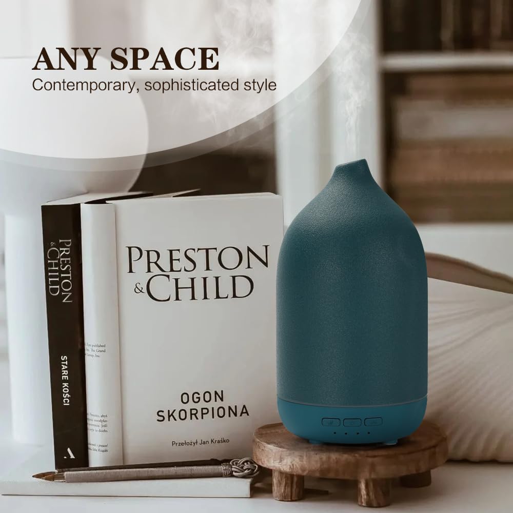 I picked the ZEIGGA LAB diffuser in green to match the green accent wall and the overall vibe of my house, and it looks even better in person. I love the stone-ceramic finish is a nice difference than the traditional plastic diffusers. The green color is soft and complements the wall without being too bold. It is quiet and has multiple timer settings that let me turn it on and forget about it for a few hours. I love having a diffuser in my office and allows for it smell whatever scent I want for the day. If I were to nitpick the 100mL size does not allow me to run the diffuser all day without refilling it more than once.