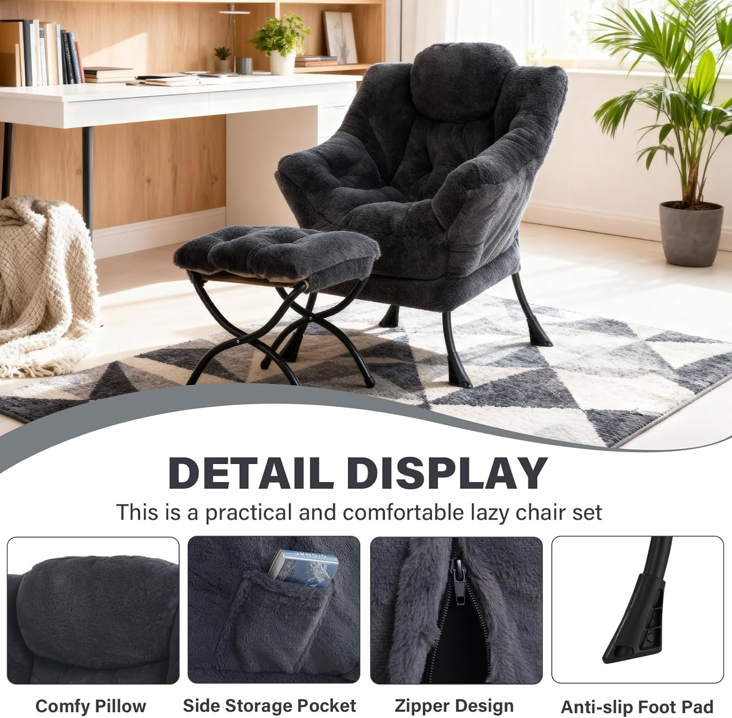 This chair is incredible—I loved it so much, I bought a second one! I originally purchased it to replace a less comfortable reading chair, and it has exceeded my expectations. Its compact size makes it a perfect fit for smaller living rooms, but don’t let that fool you—it’s incredibly comfortable. I opted for the fluffy version, which adds an extra layer of coziness and even keeps me warm.The footstool is a game-changer—every reading chair should come with one! I spent the entire day lounging in it while bingeing Onyx Storm and had zero complaints. It’s the perfect chair for those days when you want to curl up and relax for hours.It arrived super fast and was incredibly easy to assemble, which was a huge bonus. I also love the variety of color options, though I went with a classic gray (I’ll admit, I played it safe). Highly recommend this chair for comfort, style, and functionality!