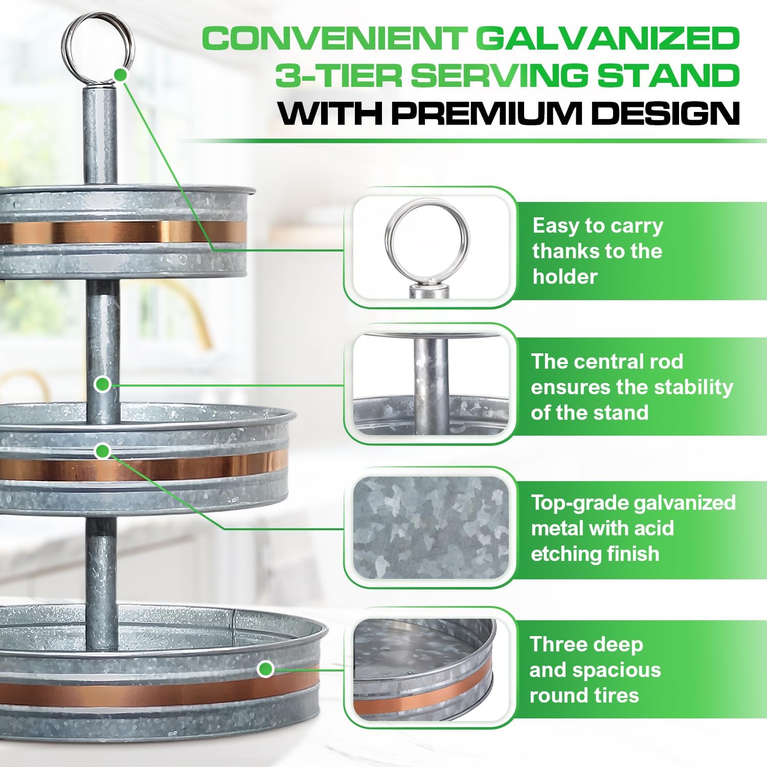 Stylish Appearance: The galvanized finish with copper trim provides a modern charm, making our tiered stand versatile for casual, elegant, or themed setups. This round tiered tray stand features a sleek silhouette, making it an attractive addition to tablescapes or countertop displays.