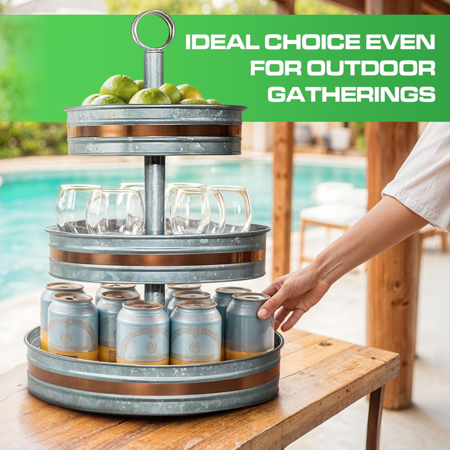 Indoor and Outdoor Versatility Tiered Trays: Our 3tier serving stand, three tier tray offers true versatility. Use it as an outdoor serving tray or an indoor centerpiece. Perfect for hosting parties at home or enjoying gatherings with family and friends, whether indoors or in nature.