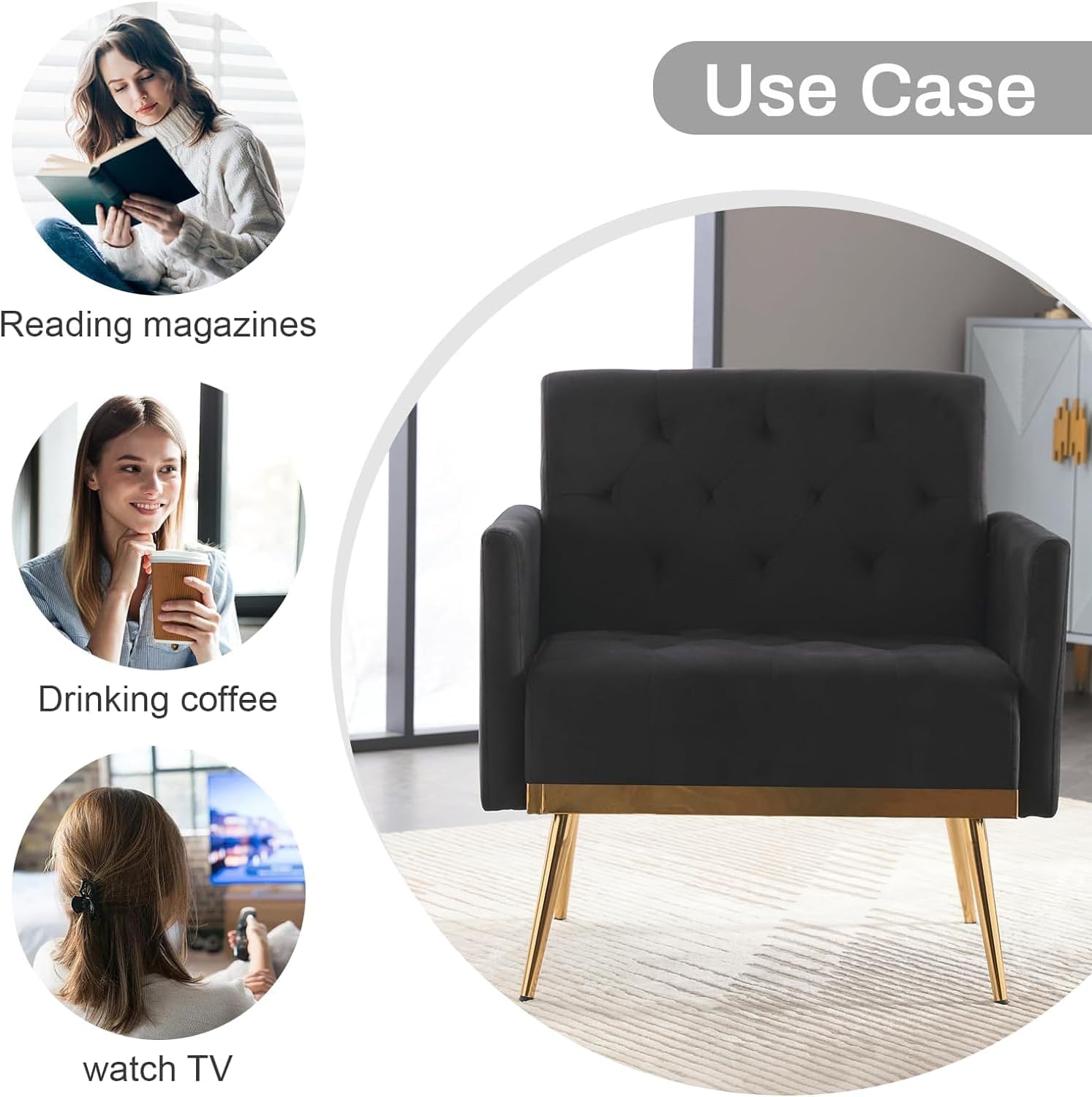 【Comfy Material】The seat of this accent chair is filled with selected sponges and covered by high-quality velet with fine texture,bringing you a super breathable,resilient and soft users experience.