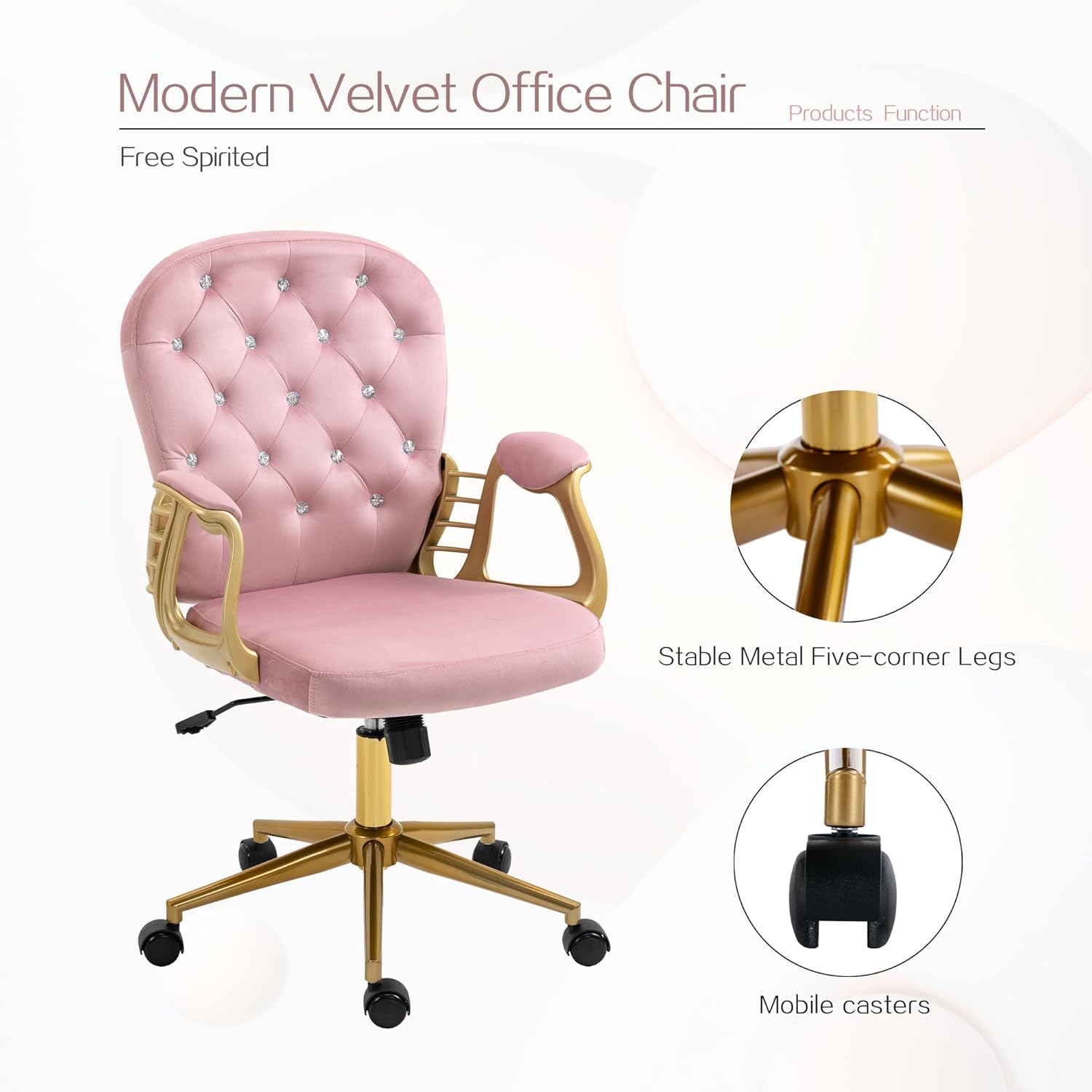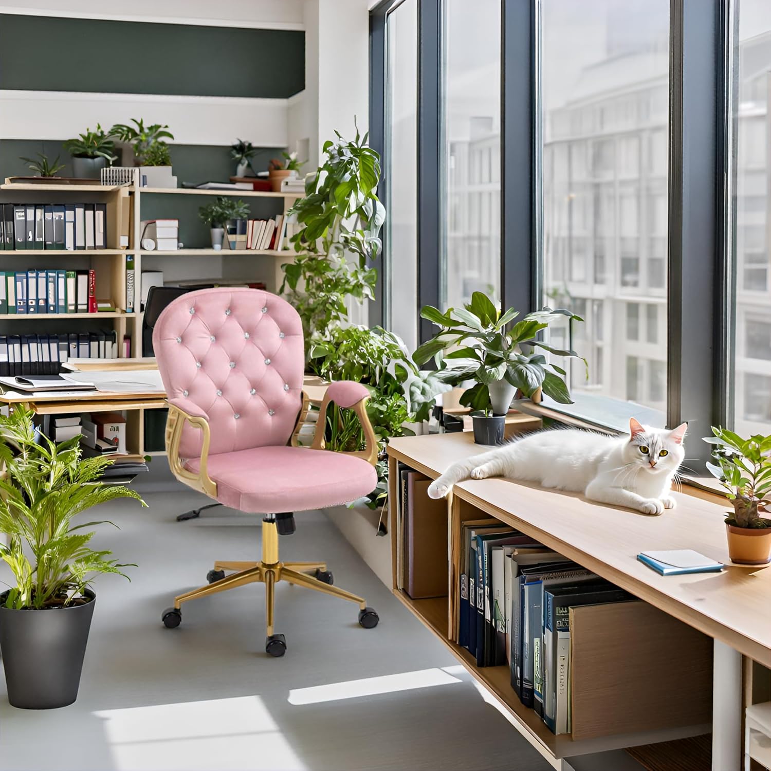 8 reviews for Velvet Home Office Desk Chair Comfy with Gold Legs and Arms, Comfortable Makeup Vanity Chair with Back and Wheels, Button Tufted Armchair Swivel Rolling Study Chair for Girls Women,Pink