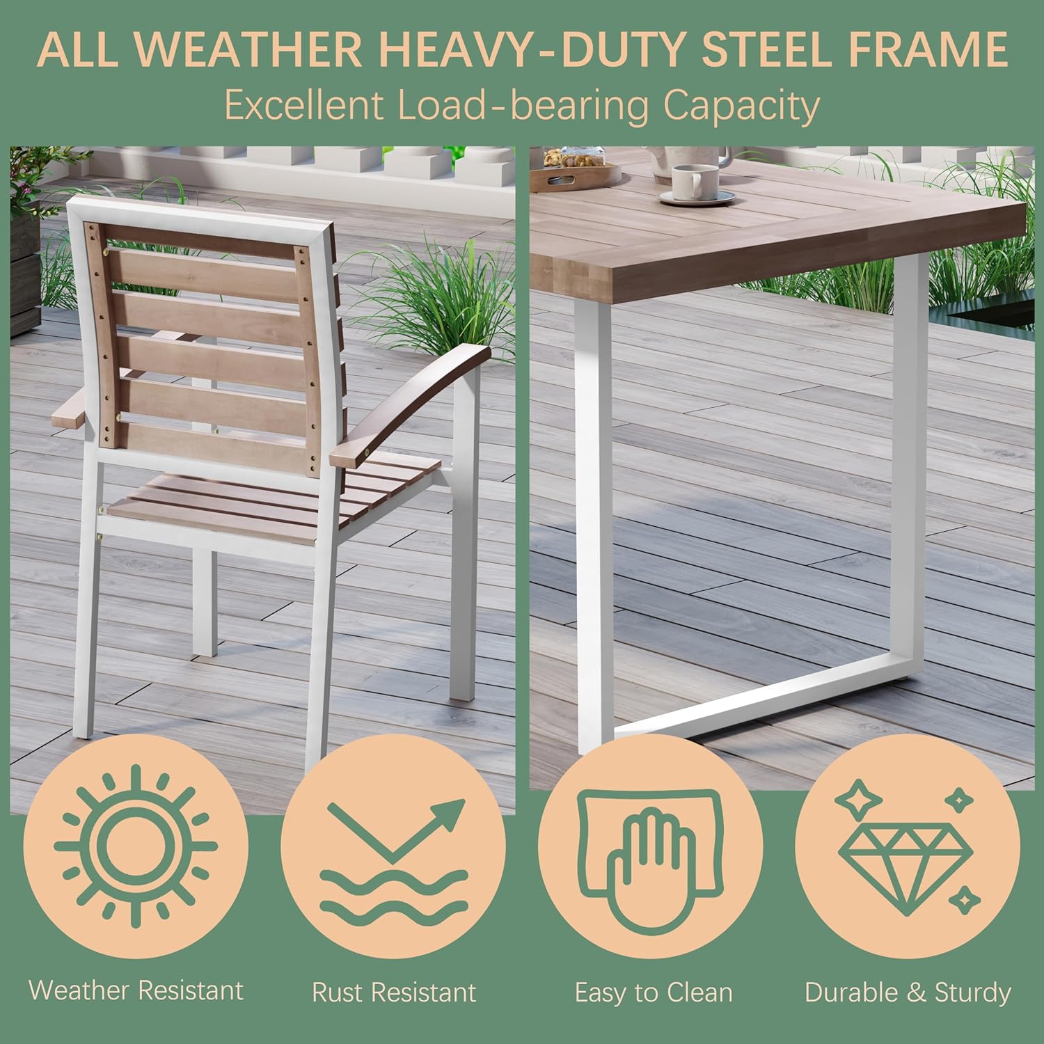 Durable Metal Frame—Built with a heavy-duty powder-coated metal frame, this patio table set is resistant to rust, corrosion, and all weather conditions. The table supports up to 220 lbs, and each chair holds up to 400 lbs, ensuring long-lasting stability and performance.