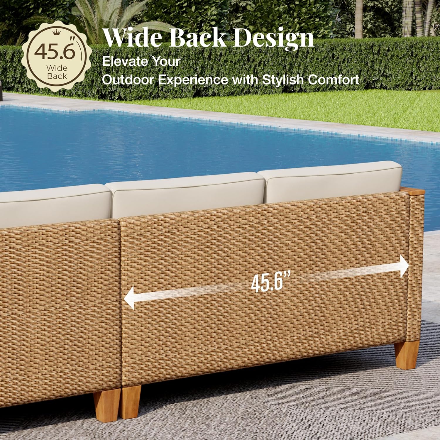 【L-Shaped Design】Featuring hand-woven double ribs rattan and beige cushions, the 3-piece combo sofa set includes 1 chaise, 1 two-seater sofa, and 1 coffee table, creating an elegant ambiance that will suit any outdoor space