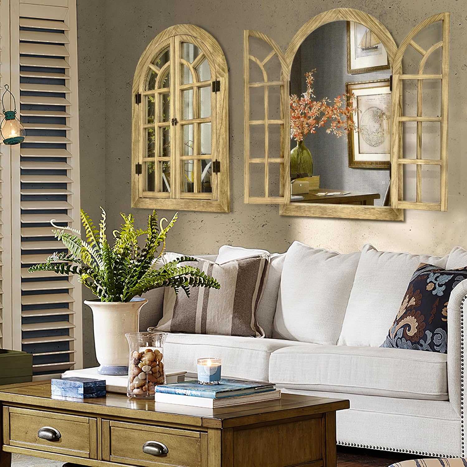 VINTAGE FARMHOUSE DECOR: A decorative framed windowpane arched mirror that opens the door will bring a farmhouse style to your home. The decorative arched mirror adds a delicate feeling to the wall, which can completely change the style of room decor, vintage and chic.